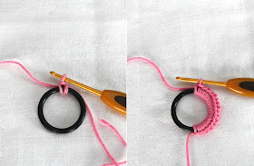* Och dra igenom garnet genom båda maskorna. Du har nu virkat den första fm runt ringen. Virka vidare så tills hela ringen är täckt.